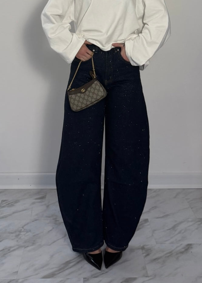 Jeans modello ballon brillantinato, quattro tasche e passanti per cintura, chiusura con cerniera e bottone.