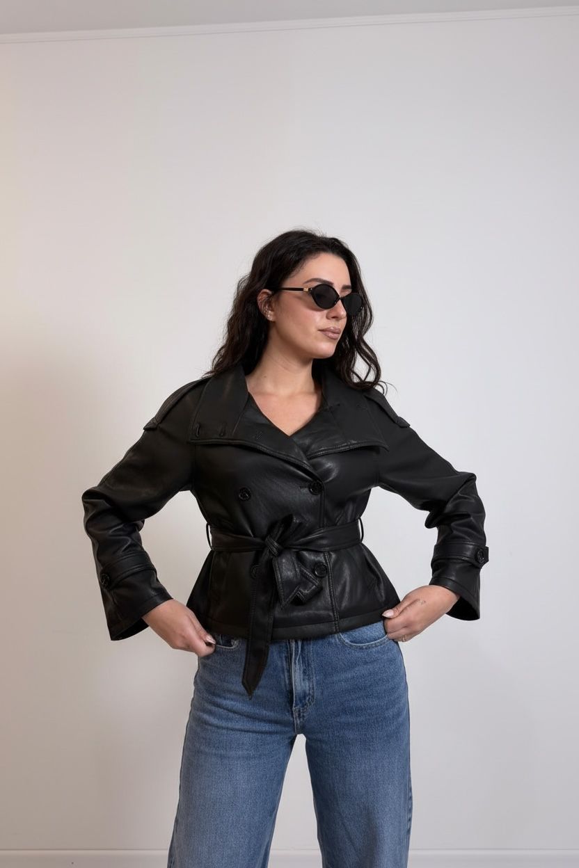 Trench in eco-pelle nero, doppiopetto con bottoni frontali, colletto alto, cintura regolabile in vita removibile.