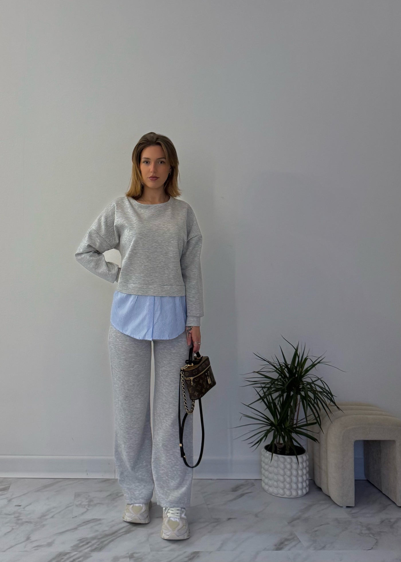 Coordinato tuta, felpa con collo rotondo e inserto in camicia.